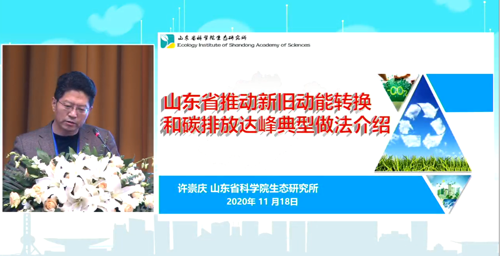 2020年11月18日,生态所许崇庆所长受邀参加“中国重点区域和城市碳排放达峰论坛”,并发表题为“山东省推动新旧动能转化和碳排放达峰典型做法介绍”的演讲。