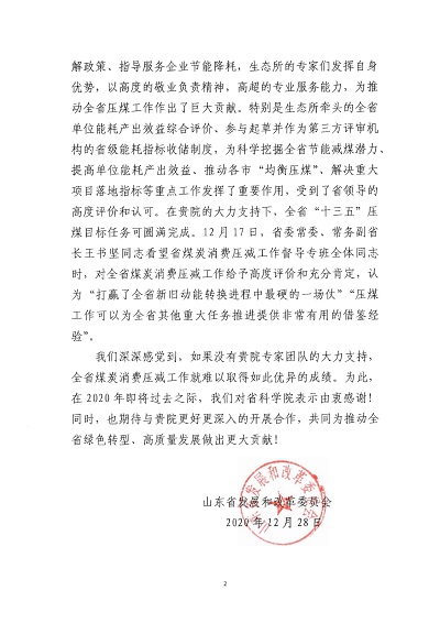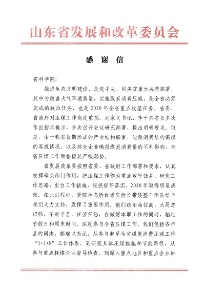 12月28日,我校(院)收到山东省发展和改革委员会发来的感谢信,感谢校(院)及生态所深度参与全省重点攻坚任务煤炭消费压减工作,校(院)及生态所政治站位高、大局意识强,不辞辛苦,任劳任怨,为推动全省煤炭压减工作做出了巨大贡献,确保了全省“十三五”煤炭压减任务可圆满完成,助推“打赢了全省新旧动能转换中最硬的一场仗”。