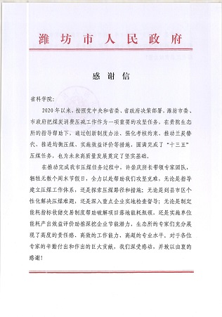 2021年1月,我校(院)收到潍坊市人民政府发来的感谢信,感谢校(院)及生态所在推动完成潍坊市煤炭消费压减攻坚任务中作出的重要贡献,对生态所的专家们展现出的高度责任感、高效工作能力、高超的专业水平表示由衷的感谢。