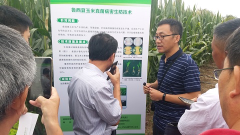 山东省科学院生态研究所承担了该项目的子课题,针对鲁西夏玉米生产中纹枯病、茎基腐病、叶斑病等发生严重的真菌性病害,利用生防菌对病原菌的抑制作用和对玉米的促生作用,通过室内筛选和田间试验,建立了鲁西夏玉米真菌病害生物防治技术。两年来,在济宁、泰安和德州等地进行了集成示范,结果表明该技术可以有效防治病害发生,减少化学杀菌剂用量30%以上。现场会上,子课题主持人张新建副所长对鲁西夏玉米真菌病害生物防治技术进行了展示和详细介绍,获得了与会专家和代表的关注和认可。