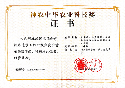 山东省科学院生态研究所环境微生物团队(第二完成单位)参与的“木霉菌生防资源评价与植物病害防控菌剂创制技术及应用”成果喜获农业部2018-2019年神农中华农业科技二等奖。